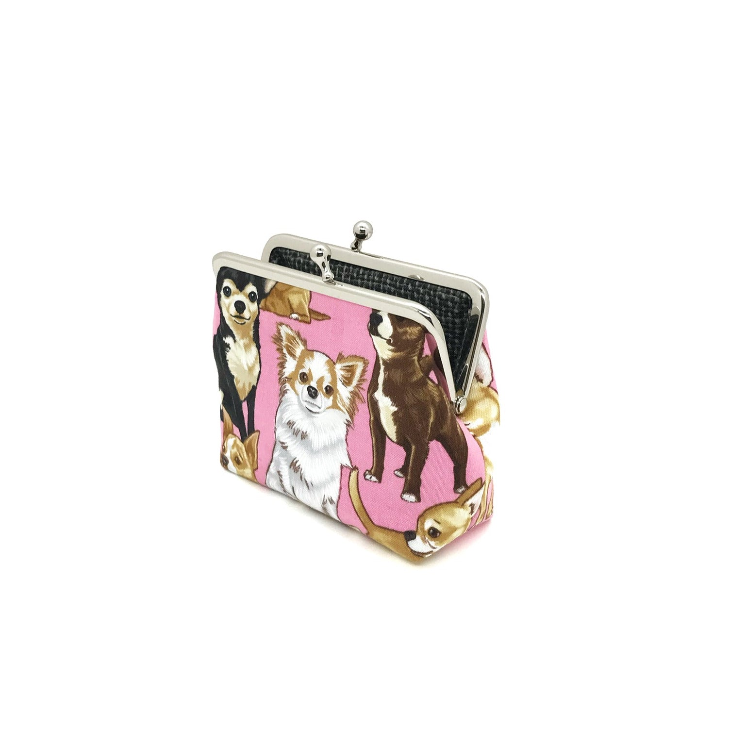 Rosa Clipbörse, Bügeltäschchen mit Chihuahuas, aus hochwertigen Baumwollstoffen. Der Oberstoff ist mit Volumenvlies verstärkt, dadurch ist es stabil und erhält einen guten Griff.
