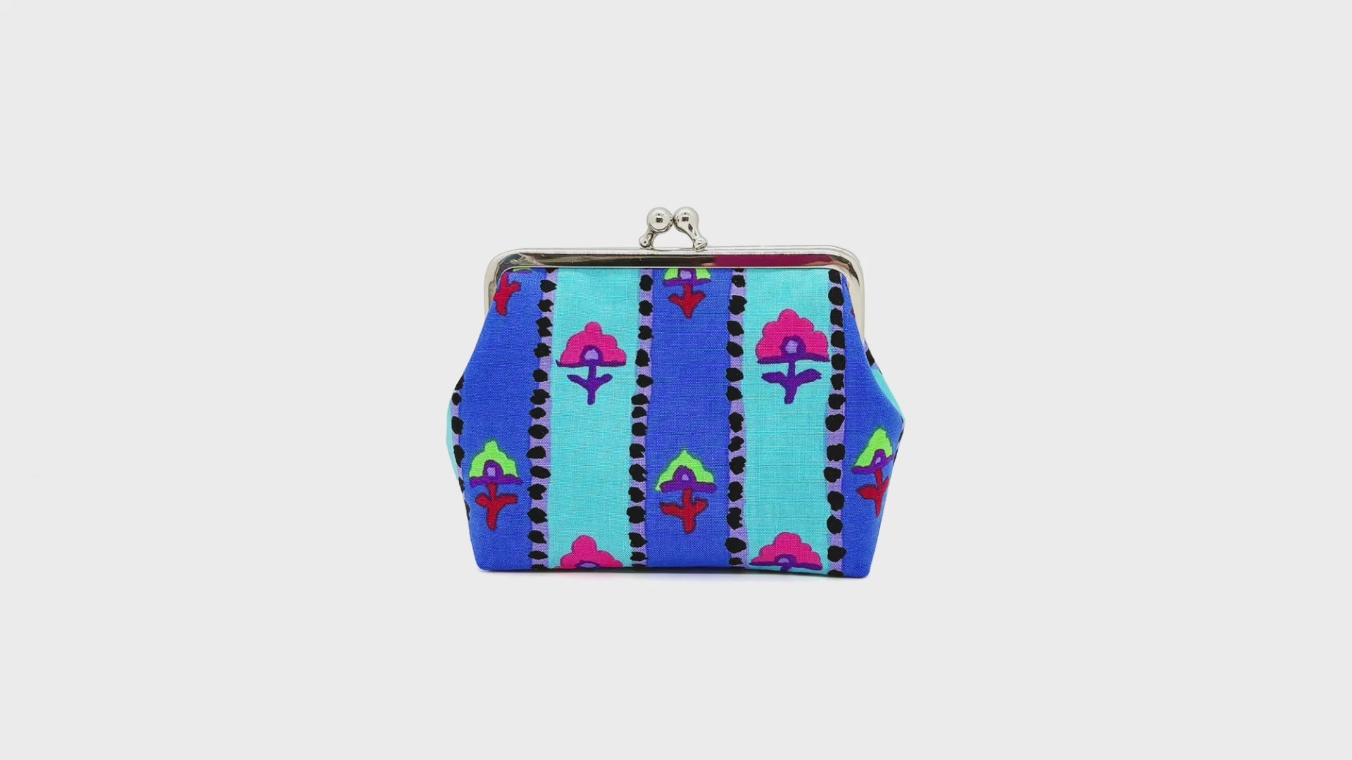 Blue clip wallet with flowers and stripes, made of high-quality cotton fabric. The outer fabric is reinforced with wadding for stability and a good grip.